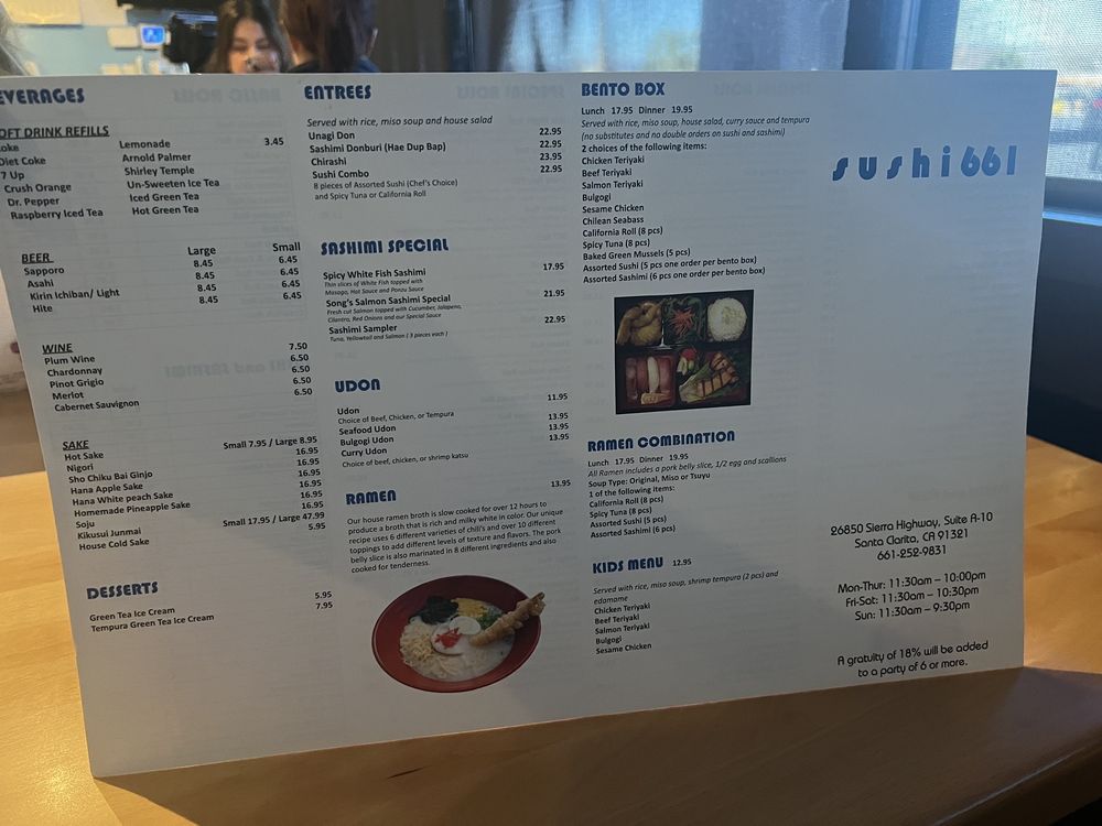 Sushi 661, located in Santa Clarita, offers a diverse menu of fresh and delicious sushi, ramen, and bento box options. Customers praise the fast service, fresh ingredients, and attentive staff. The cozy dine-in area, ample parking, and accommodating service make it a favorite spot for both dine-in and takeout orders. The shrimp tempura, sushi rolls, and bento boxes are highly recommended, with a variety of sauces and flavors to choose from. The bento box, in particular, stands out for its generous portions and well-balanced meal options. Whether you're a sushi lover or prefer ramen or bento boxes, Sushi 661 is a great choice for a satisfying and enjoyable dining experience.